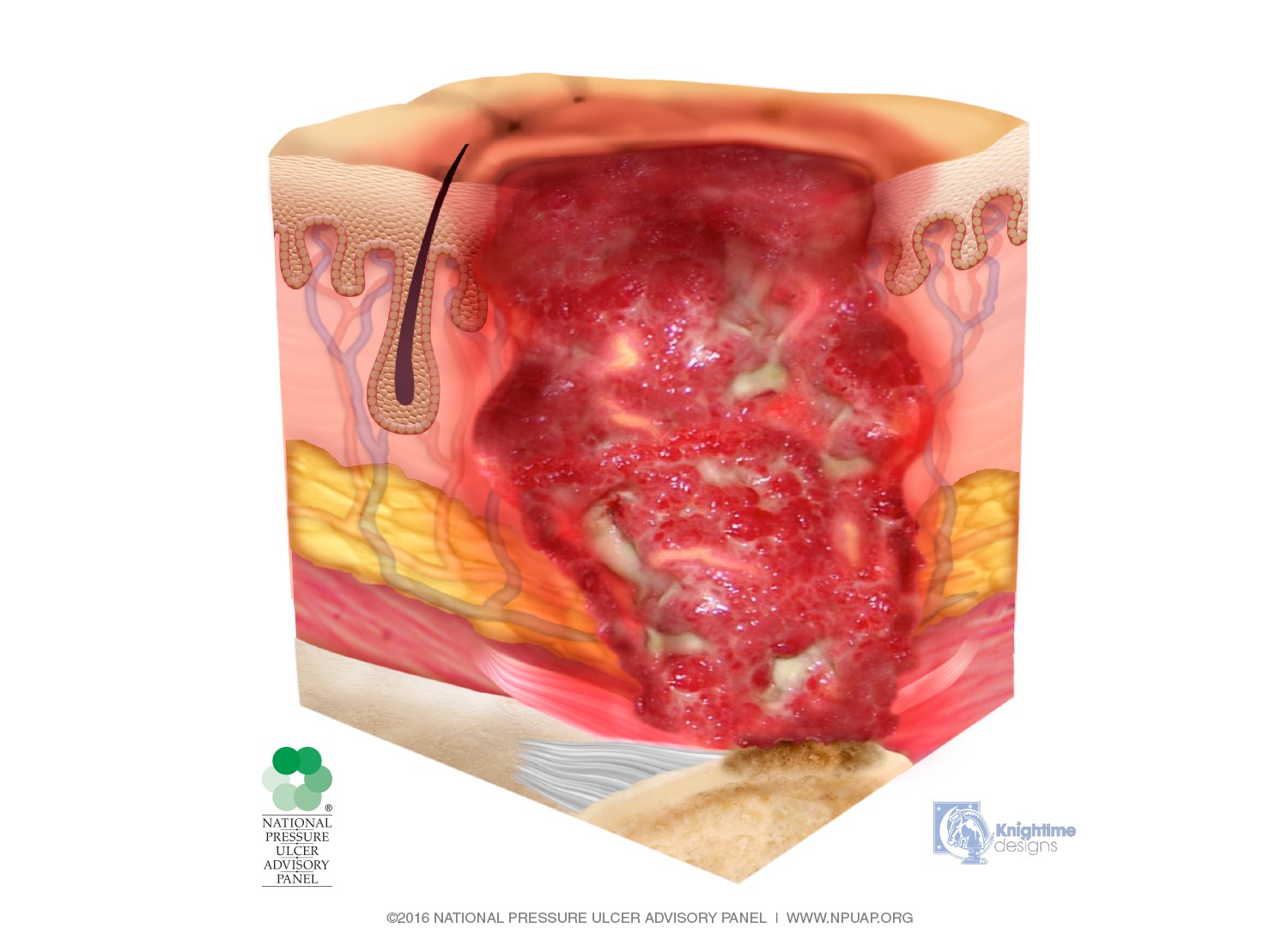Full-thickness tissue loss. Subcutaneous fat may be visible but bone, tendon or muscle are not exposed.